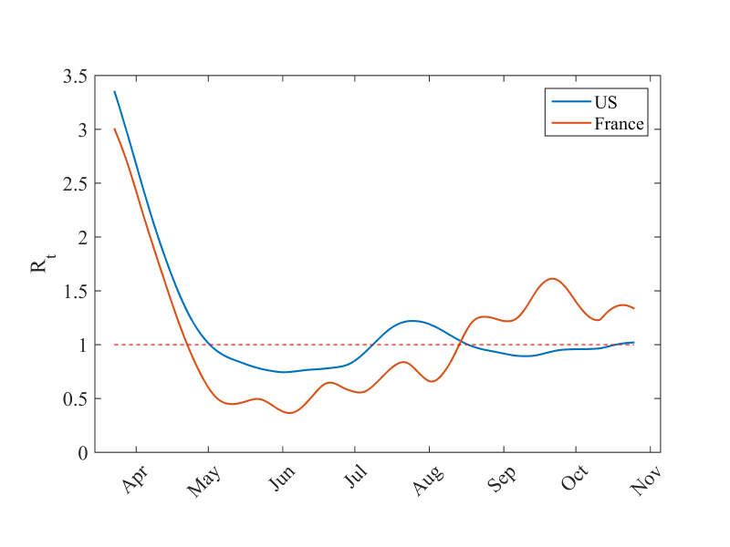 27 octobre 2020 | L. Roques | Dynamique du taux de reproduction efficace France vs Etats Unis. Après un effet du confinement plus fort en France, avec des valeurs de Rt nettement en dessous de 1 de début mai à début août, la tendance semble s'inverser à partir de septembre. Les Etats Unis conservent une valeur de Rt proche de 1, contre 1.3 en France en octobre. Une explication pourrait être liée aux taux d'immunité dans ces deux populations. Le PFR (population fatality ratio, nombre de morts divisé par la population totale) est de 69/100 000 aux USA vs 51/100 000 en France. Si l'on suppose que le taux de létalité (IFR) est le même dans les deux pays et que l'ensemble des patients infectés sont immunisés contre la COVID-19, le taux d'immunité aux USA serait 35% plus élevé qu'en France, ce qui expliquerait la différence entre les valeurs observées de Rt. La méthode de calcul du Rt est la même que dans le post du 30/09/2020. Elle est détaillée dans One Health. doi:10.1016/j.onehlt.2020.100187