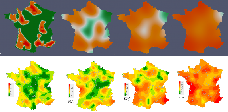 La première ligne représente la prédiction de la propagation des symptomes de la grippe. La deuxième ligne montre les données interpolées fournient par le réseau Sentinelles. On peut constater que l'étude menée sur les données 2019 prédit une vitesse de propagation de 90 km/semaine, similaire à celle observée en 2020. |